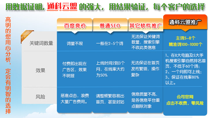 | 我們根據(jù)客戶提供的網(wǎng)站進行優(yōu)化調(diào)整,之后加入通科云盟系統(tǒng),分享云盟大系統(tǒng)的海量資源。 | 根據(jù)百度鳳巢系統(tǒng),與客戶協(xié)商匹配好關(guān)鍵詞,讓每個客戶的關(guān)鍵詞都有專業(yè)性、針對性!絕對精準(zhǔn)超值! | 贈送通科云盟關(guān)鍵詞查詢助手,清楚查詢當(dāng)天實時關(guān)鍵詞排名情況,網(wǎng)站狀況了然于胸!確保關(guān)鍵詞排名首頁! |